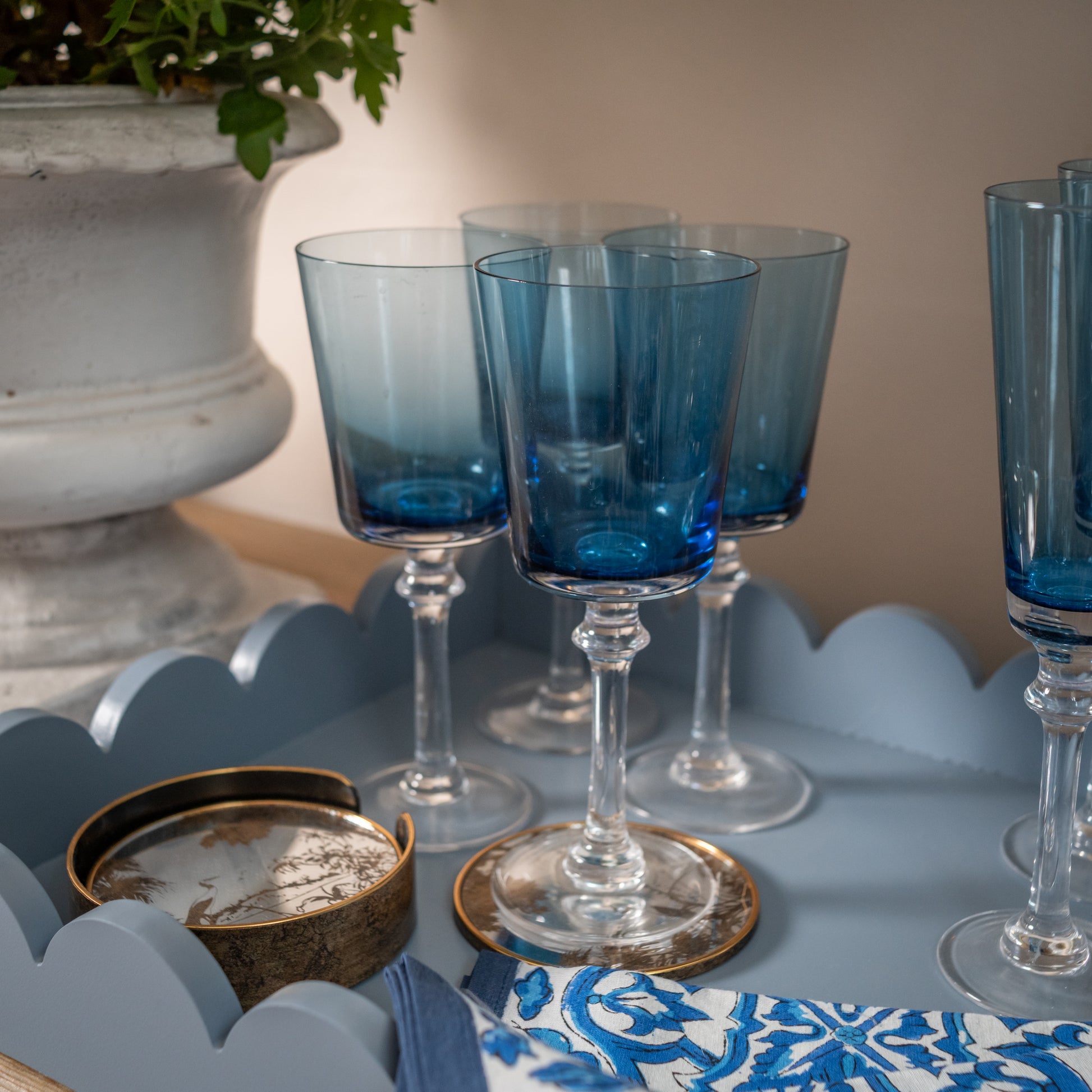 These stunning blue Amalfi wine glasses are a fun addition to any dining experience. The stem on the glass is iconic and reminiscent of the famous French crystal house. Pair these with our Amalfi Blue Champagne Glasses to complete your set.