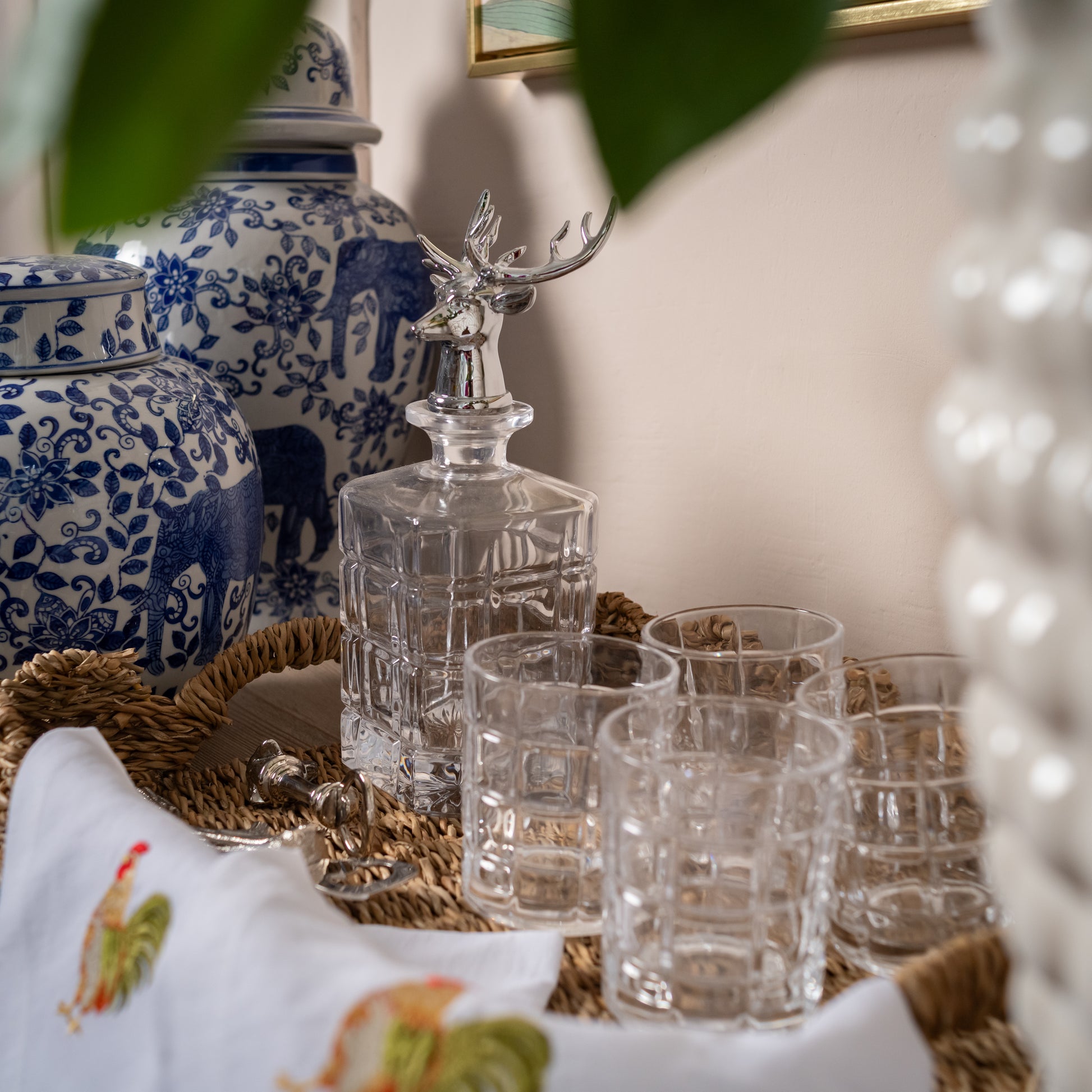 This stunning formal decanter set for four makes for the perfect post dinner treat. The Balmoral stag head stopper and the tartan etching on the glassware sets the tone. This set would look fantastic sitting on the bar or displayed on a sideboard.