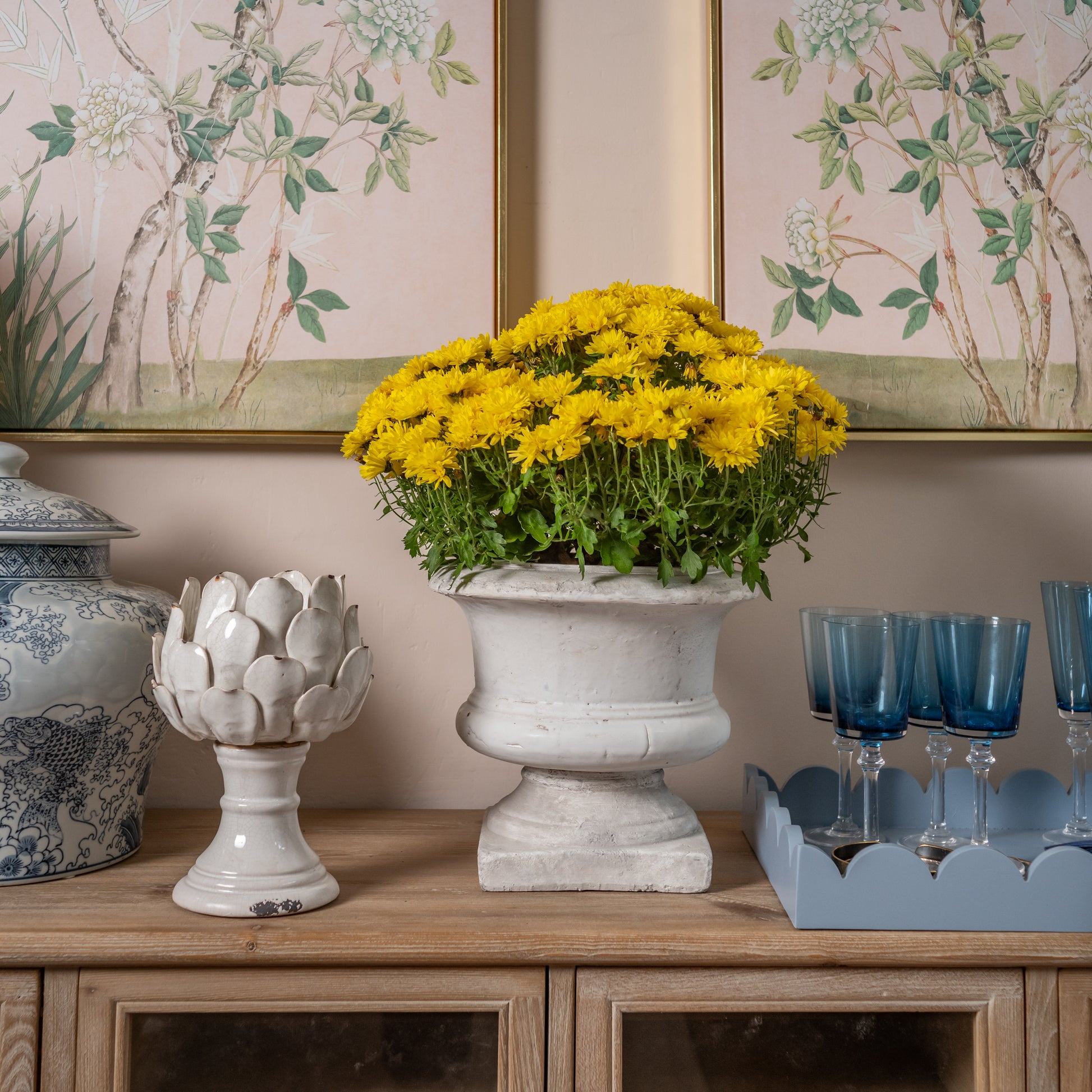 This beautiful cream distressed artichoke candle holder is such a stunning piece. Use it stand alone or in a pair. Perfect for larger candles to create a wonderful ambiance. The distressed cream colour gives texture and will work with most interiors.