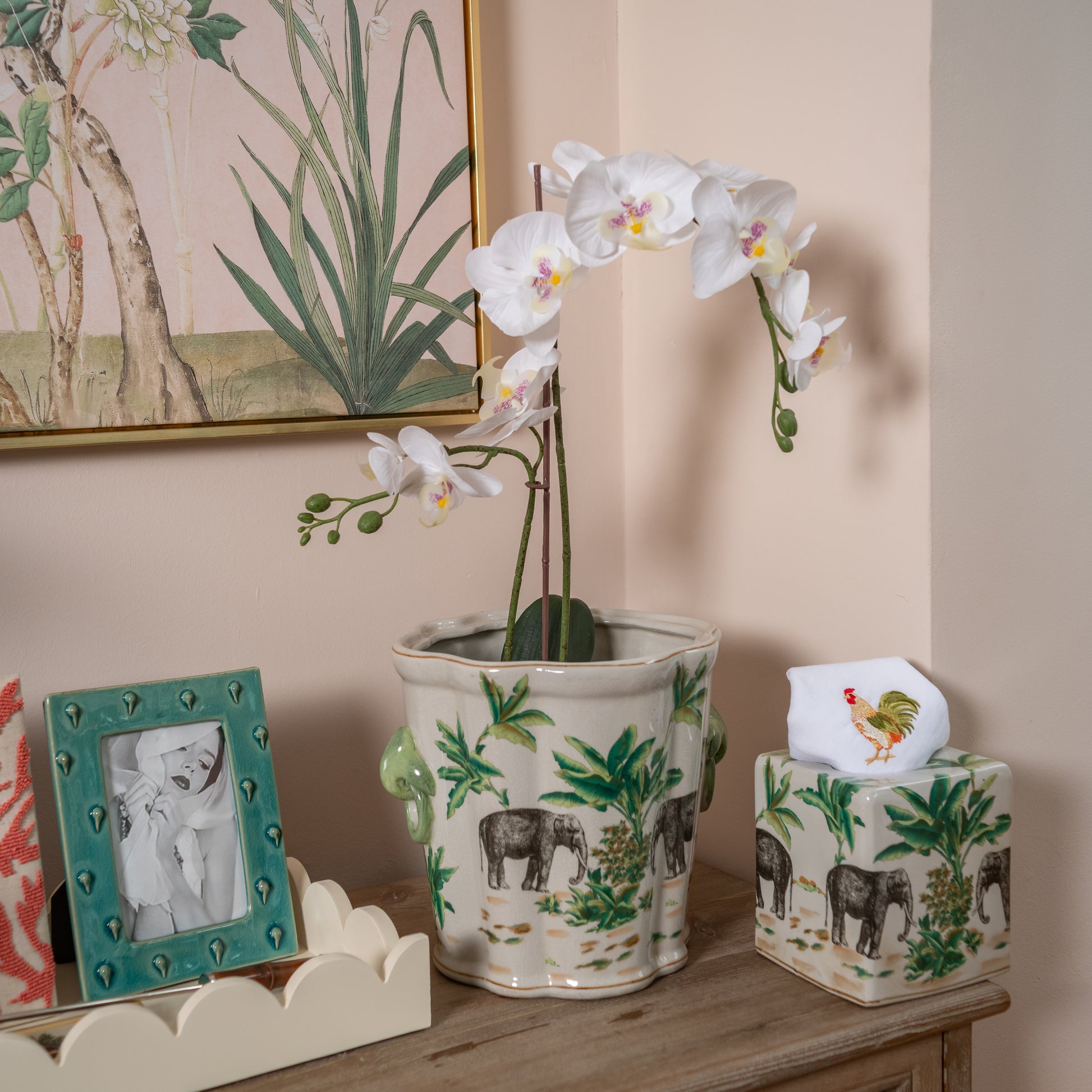 This striking ceramic planter is an eye catcher to be sure. The warm green tones coupled with the safari scene makes it an instant talking piece. Use your planter to house indoor plants, a centrepiece for your tablescape, a beautiful storage place or even an extraordinary ice bucket table side. Its uses are many and its beauty is plentiful.