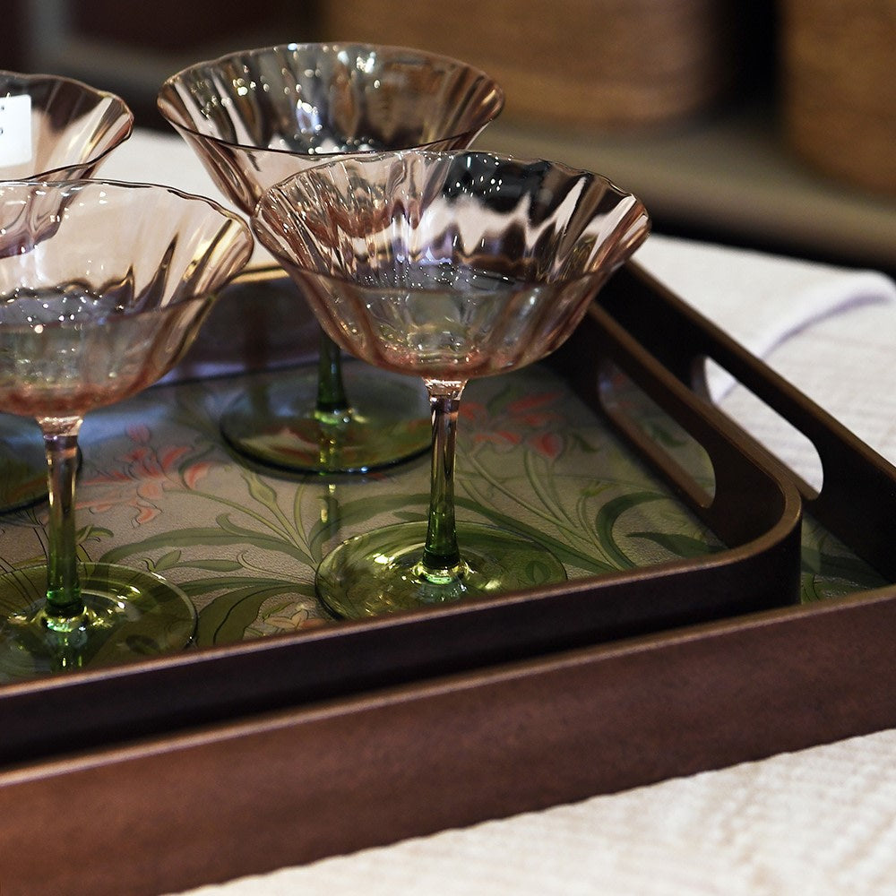 The colour of the pink against the green of these champagne flutes are just so pretty. The delecate coupe and stem makes for a beautiful table scene. They evoke memories dining al fresco in the garden or cozy indoors by the fire. Combine the Champagne Coupes with the Martini Glasses to complete your Set.