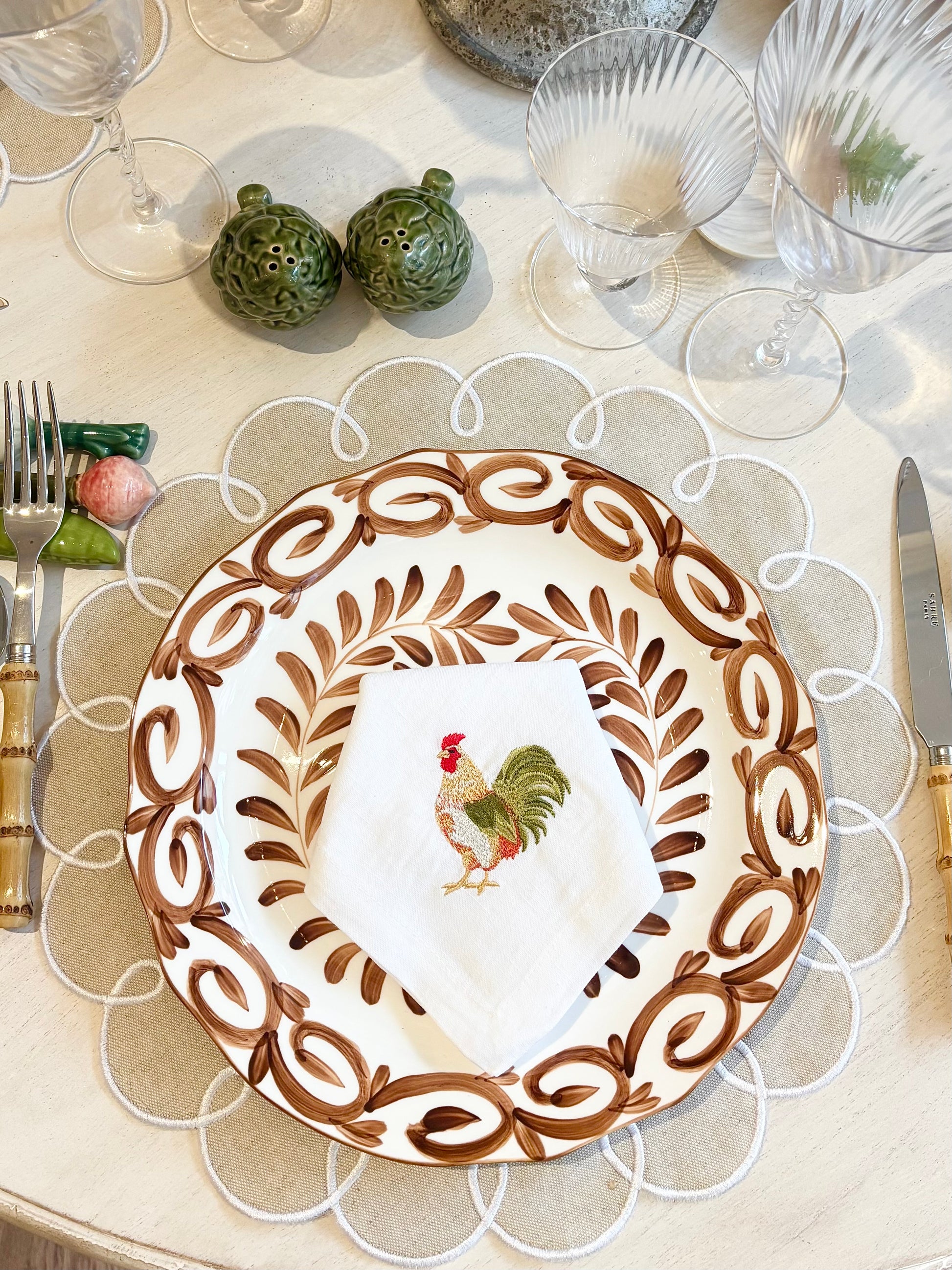 This striking linen dinner napkin is handmade by European artisans. The colour and detail of the rooster warm up any table. Create an autumnal country moment with these beauties.